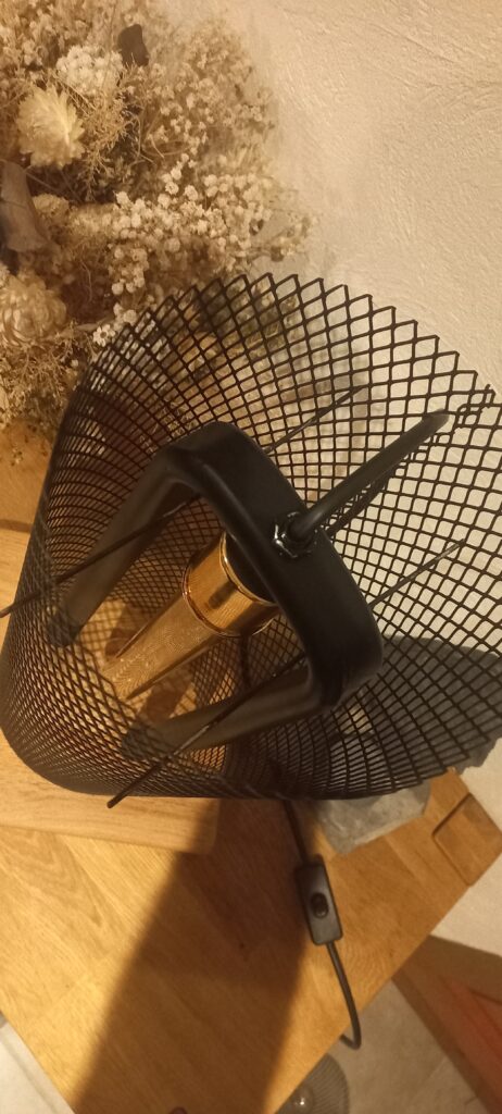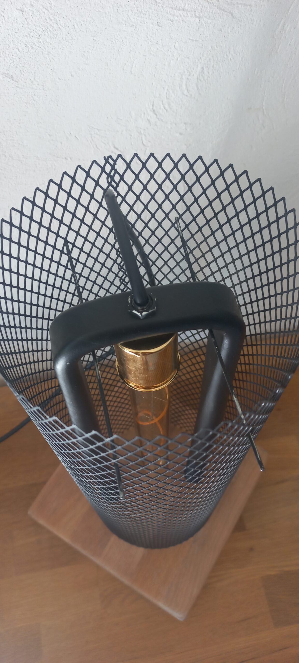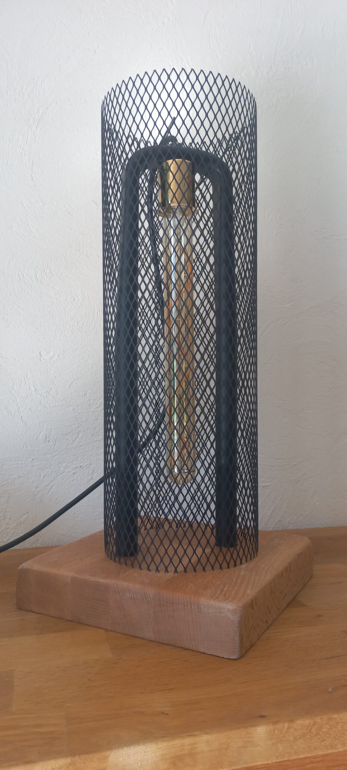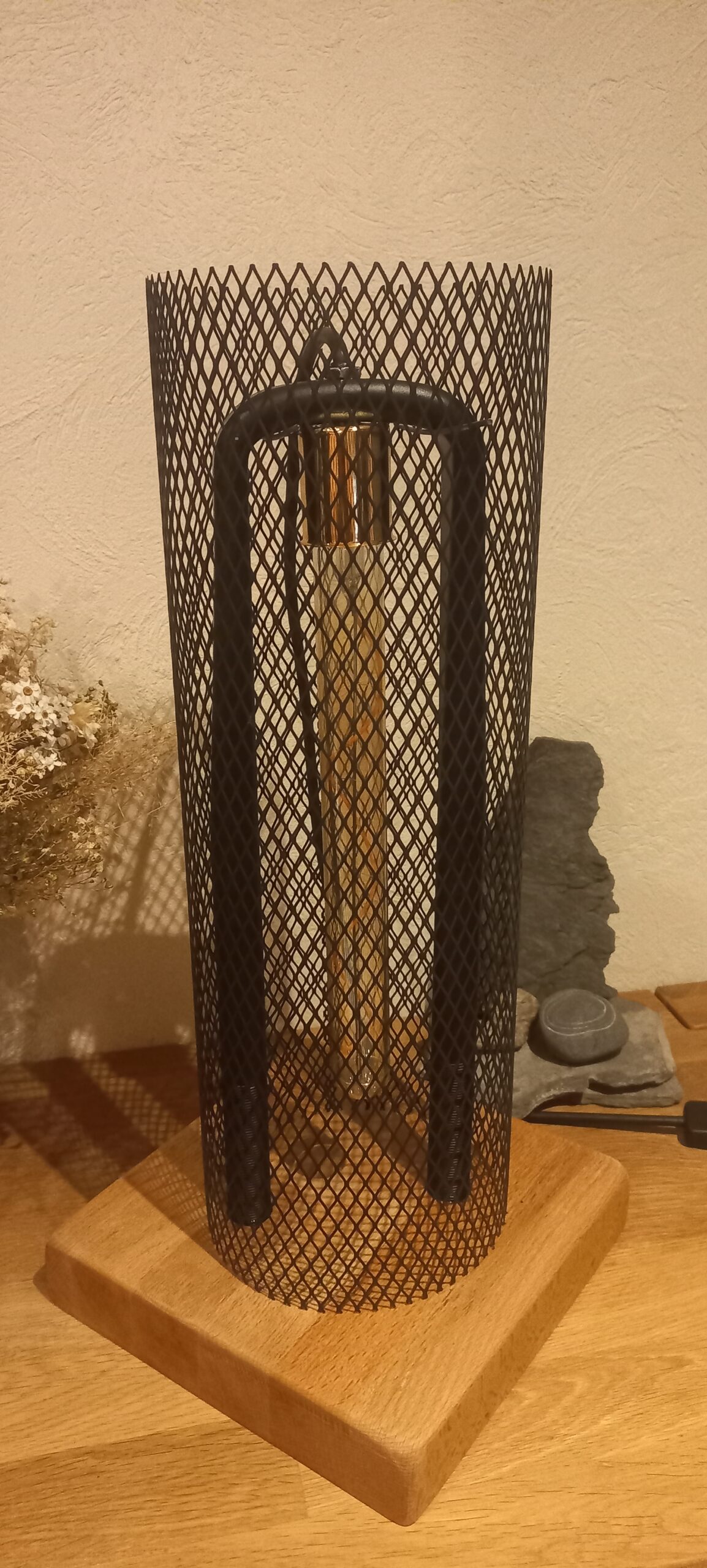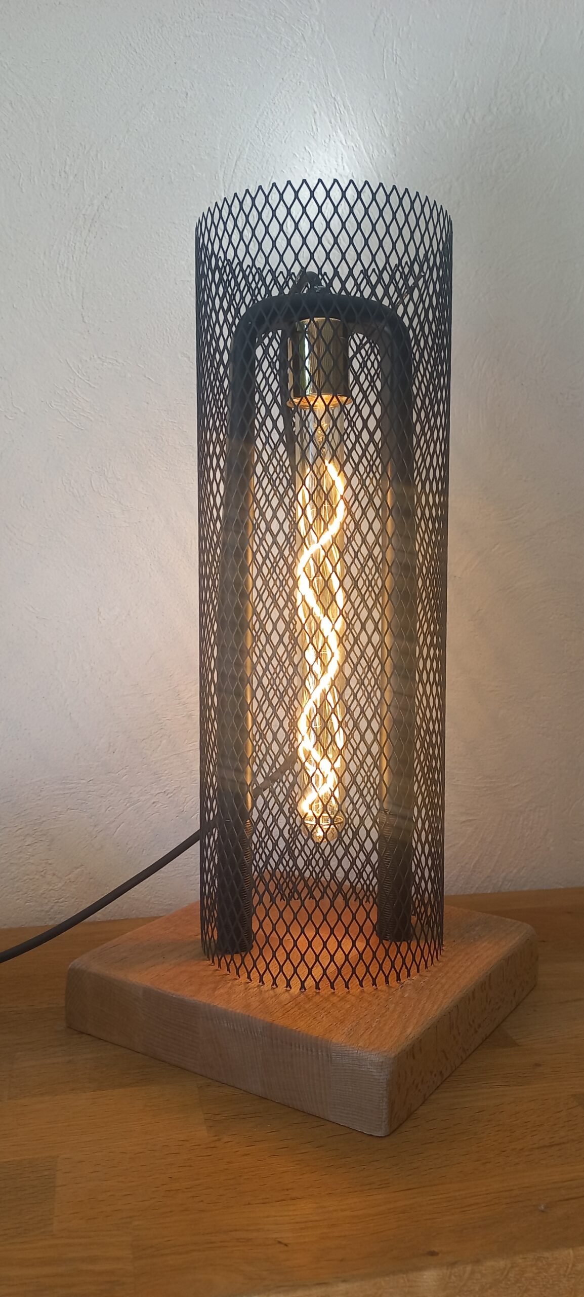 Grille de filtre , bride, socle en hêtre huilé, ampoule Edison spirale