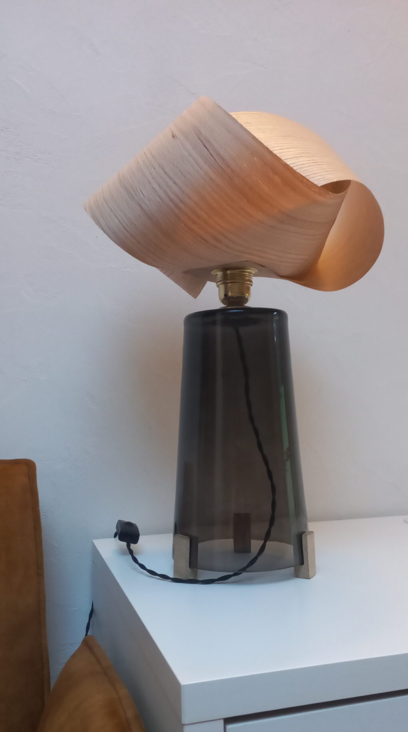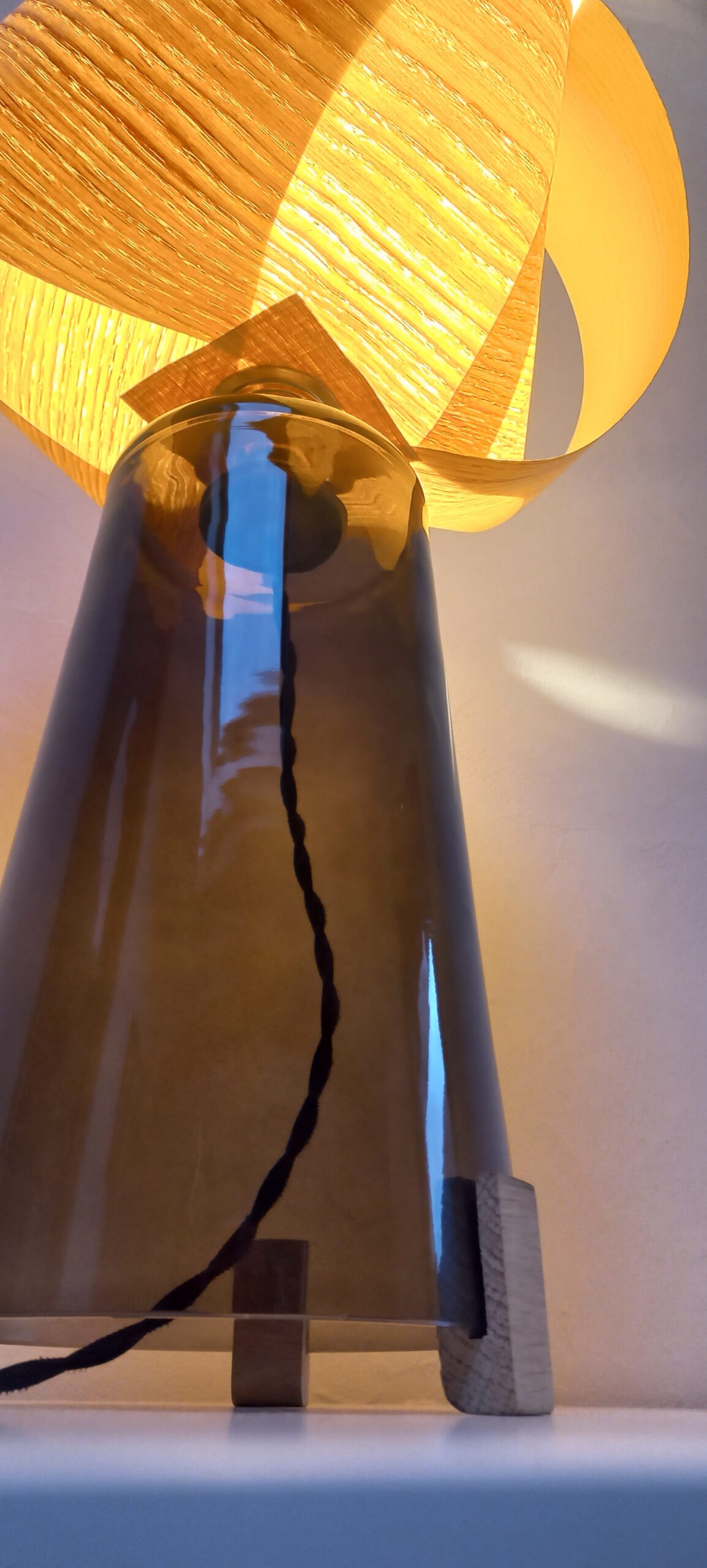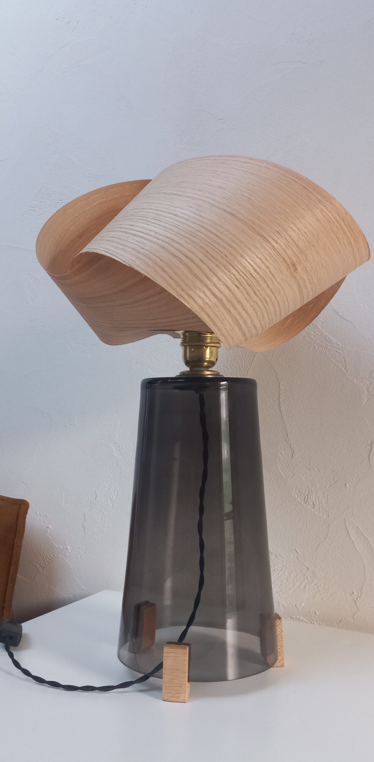en chêne clair, socle en verre fumé transparent, 3 pieds en chêne. hauteur 50cm, diamètre 30cm.