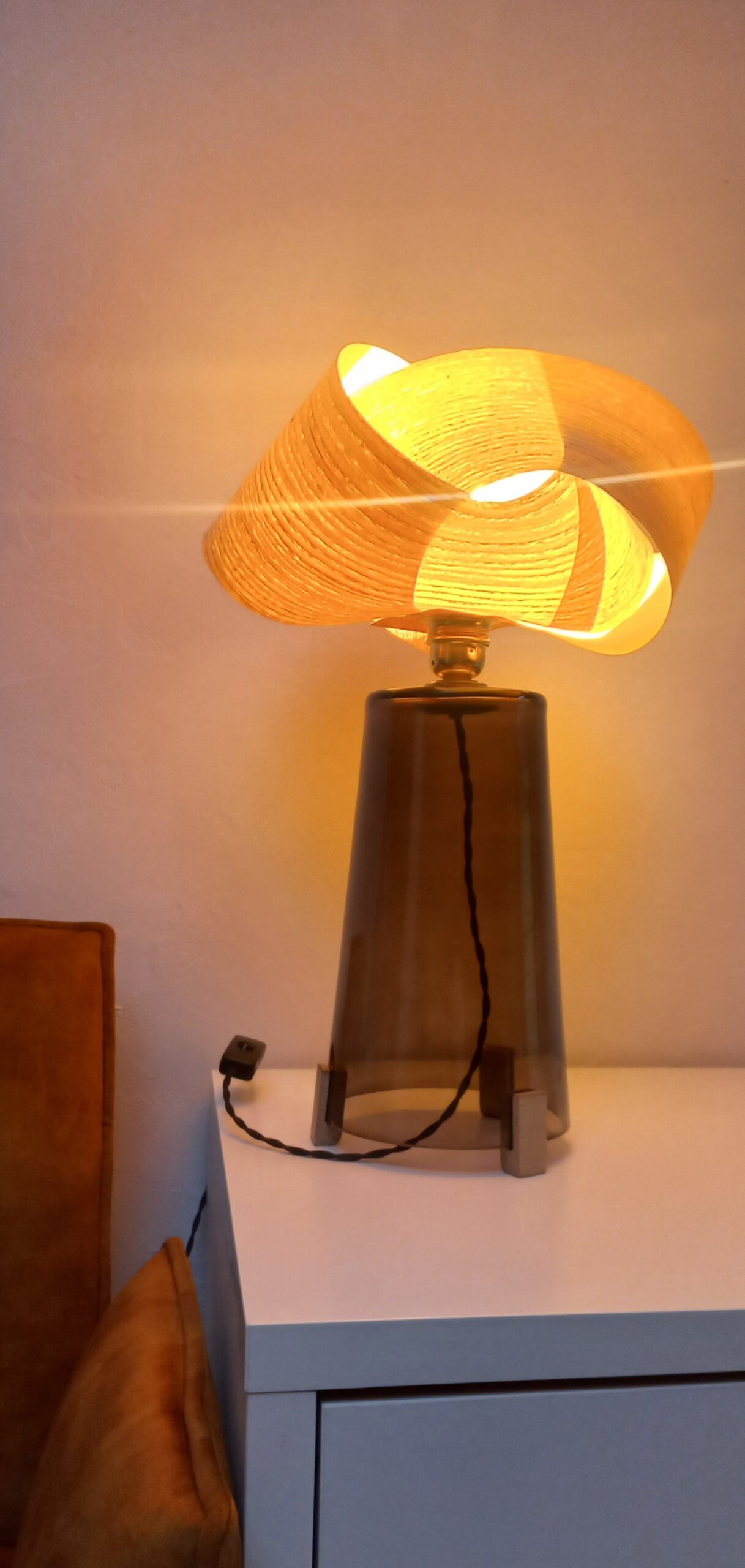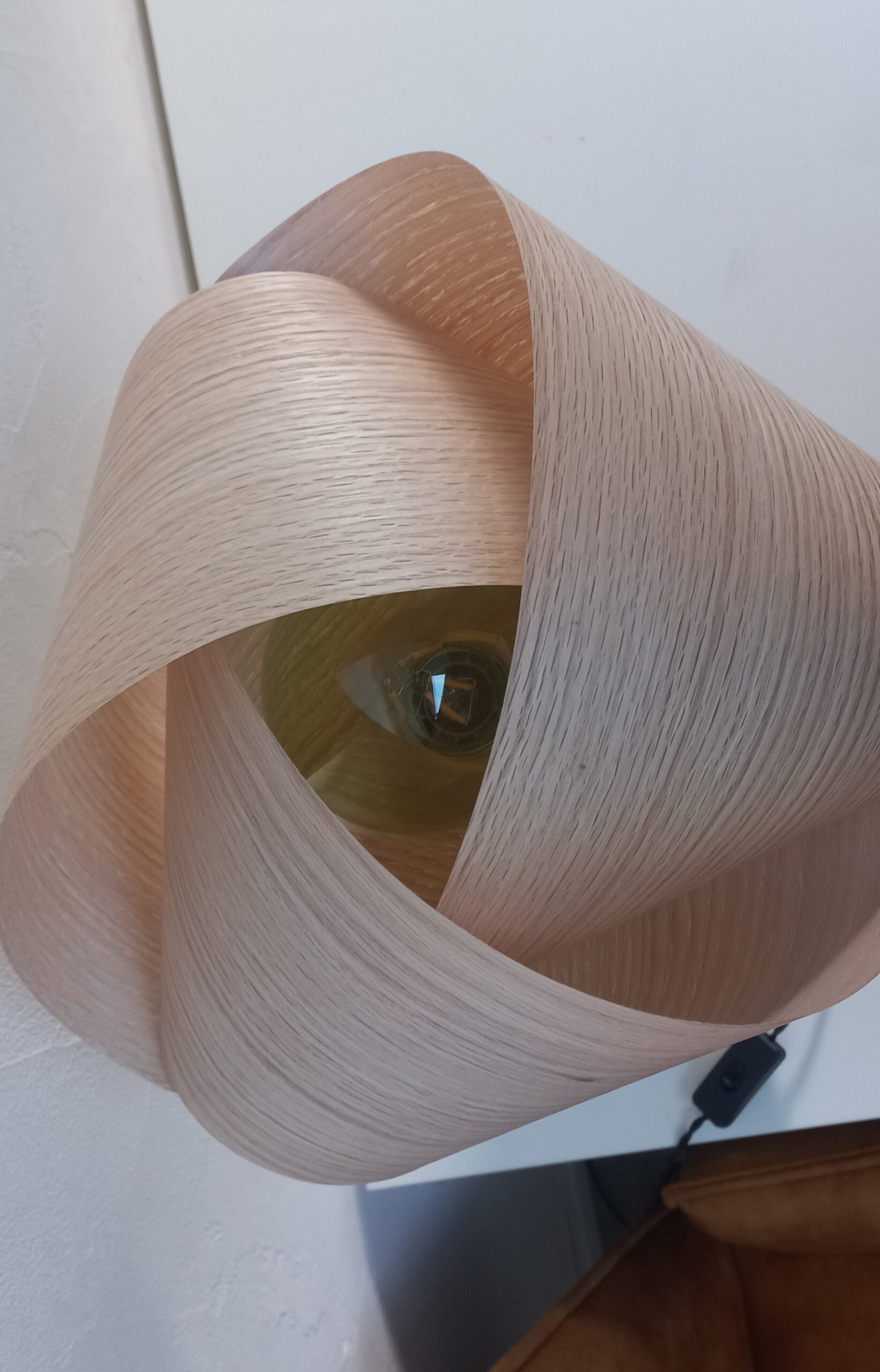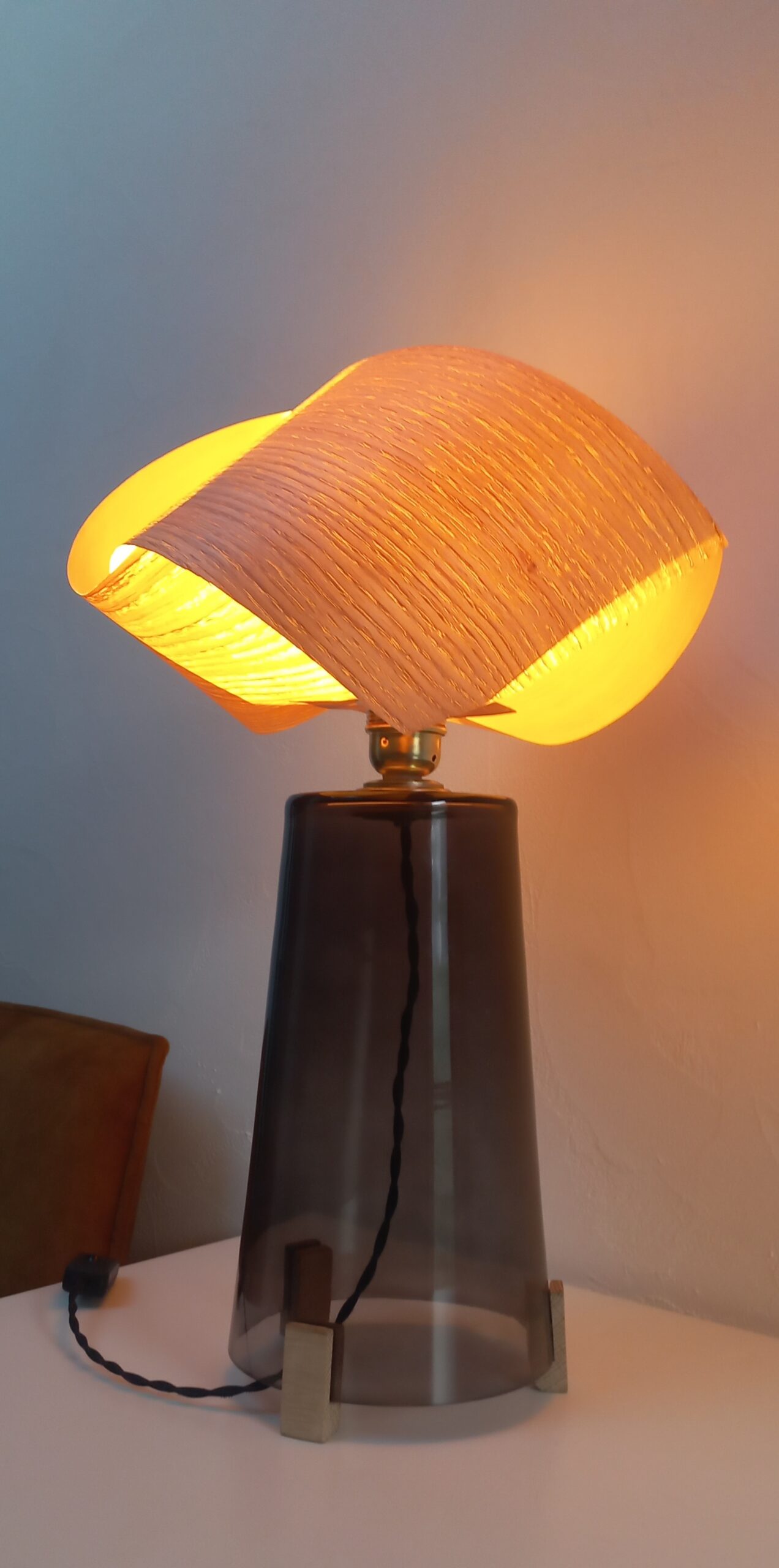 en chêne clair, socle en verre fumé transparent, 3 pieds en chêne. hauteur 50cm, diamètre 30cm.