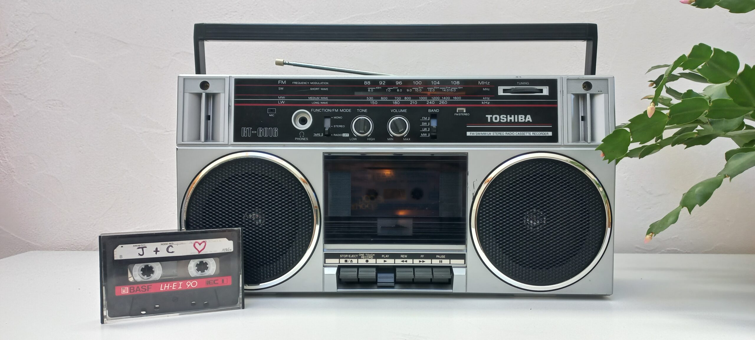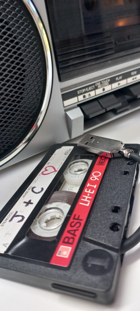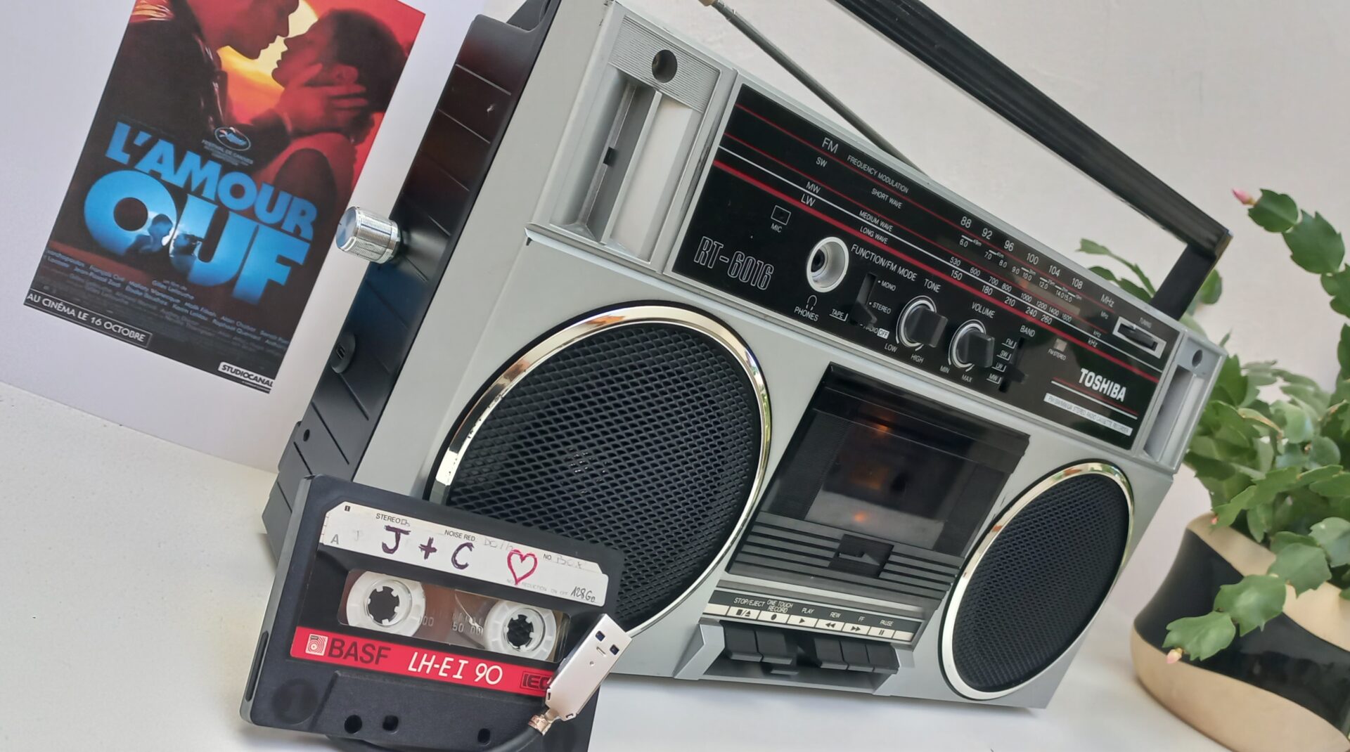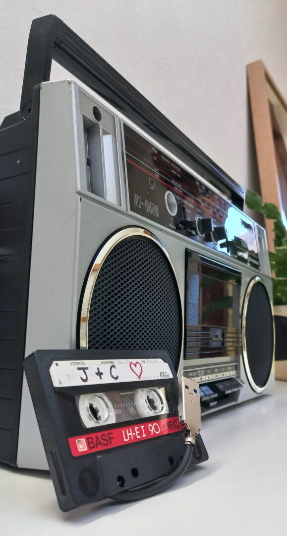 Radio Cassette Toshiba RT6016 de 1986 💑, converti en enceinte Bluetooth autonome rechargeable, Mode FM Opérationnel, Lecteur cassette HS. Bonus = Cassette audio de « Jackie + Clotaire 💖 » convertie en stockage externe USB 128Go.