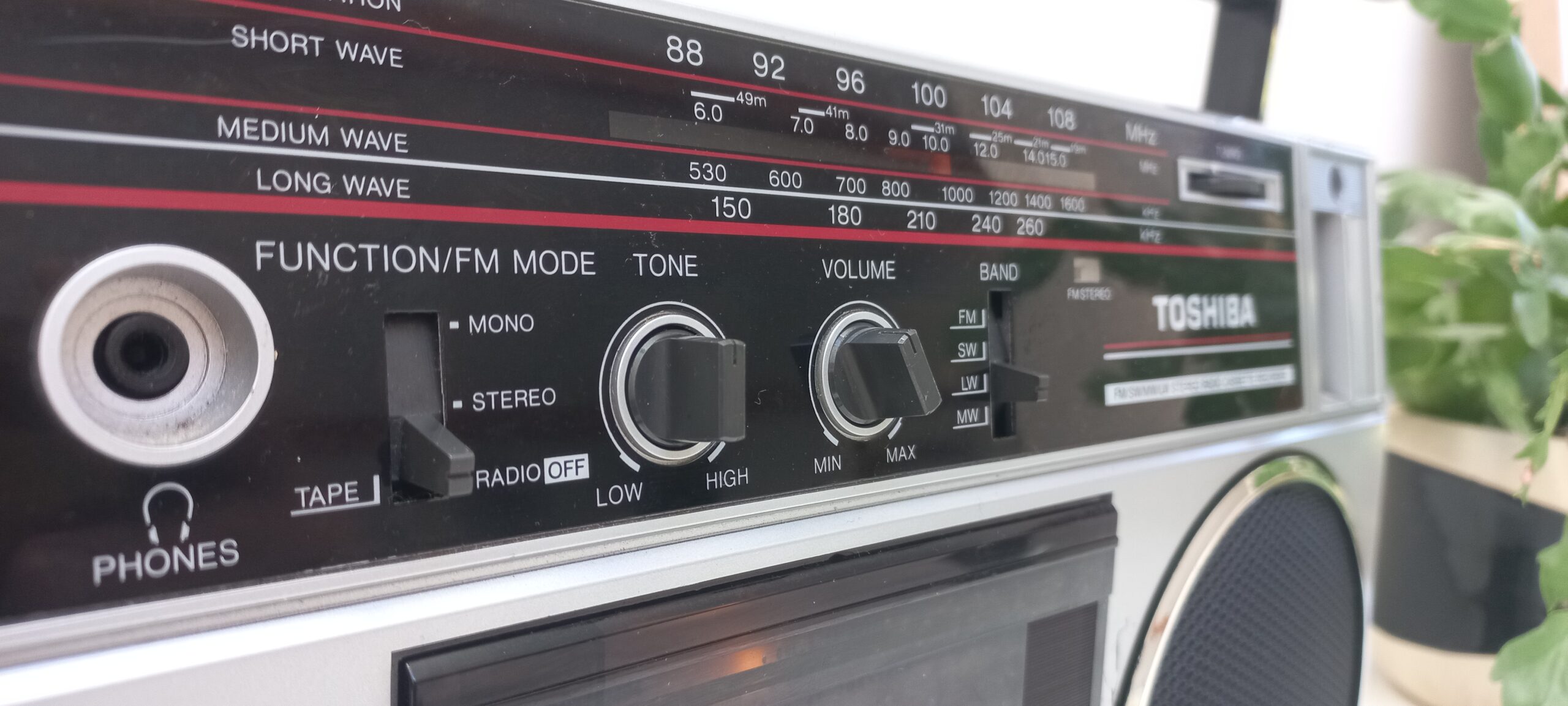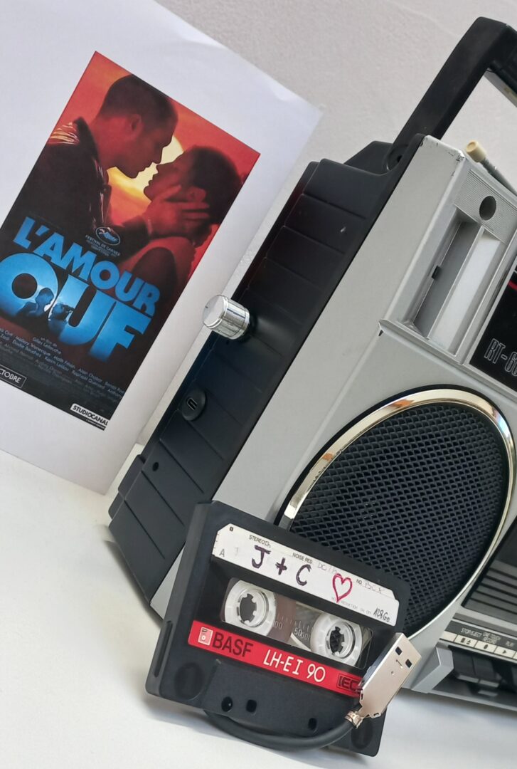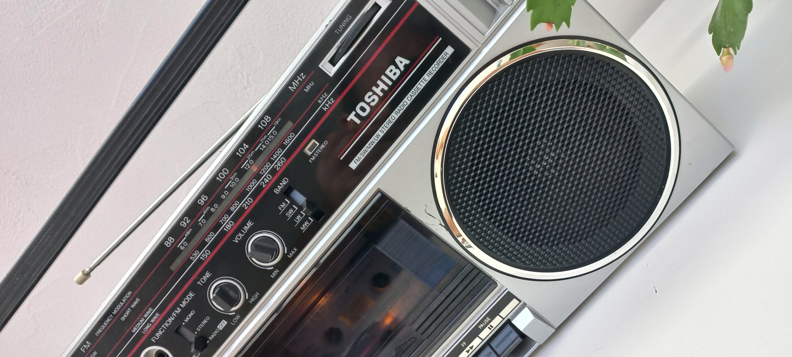 Radio Cassette Toshiba RT6016 de 1986 💑, converti en enceinte Bluetooth autonome rechargeable, Mode FM Opérationnel, Lecteur cassette HS. Bonus = Cassette audio de « Jackie + Clotaire 💖 » convertie en stockage externe USB 128Go.